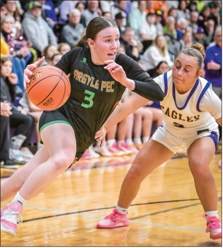 Argyle/Pec’s Loretta Tisch drives past Eagle defender Eliza Gordon. Photo by Bret Peterson. Clinging to a slim league with only a few ticks left on the clock the…